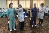 Na manhã desta quarta-feira, 20 de janeiro, a equipe de profissionais do Hospital e Maternidade Sagrada Família que atua diretamente com pacientes com Covid-19 receberam a vacina CoronaVac. As primeiras doses do imunizante foram aplicadas na técnica de enfermagem Bruna Letícia Crivelli, que trabalha na UTI, e na médica Sabrina Garcia Schwingel, coordenadora da equipe assistencial de Covid-19 da instituição de saúde.