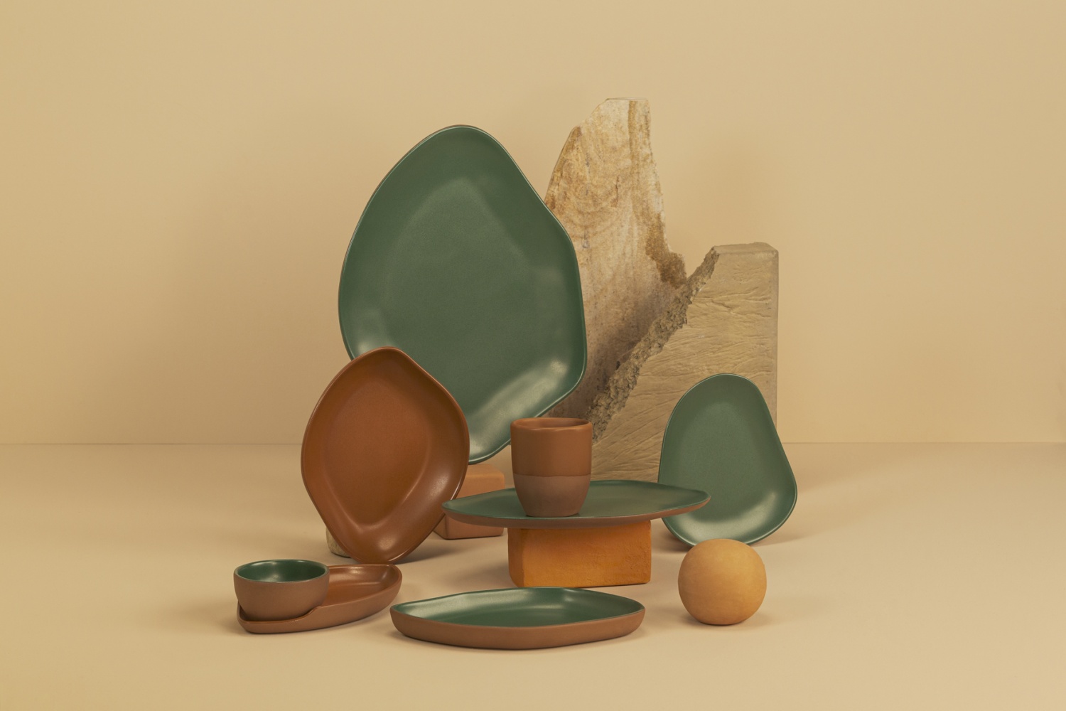 A coleção Odisseia é composta por 8 peças: prato, copo, travessa, tigela e petisqueira, com diferentes propostas de uso. As cores verde e caramelo decoram os produtos e compõem uma harmonia de tons terrosos, adicionando um toque de aconchego à coleção.