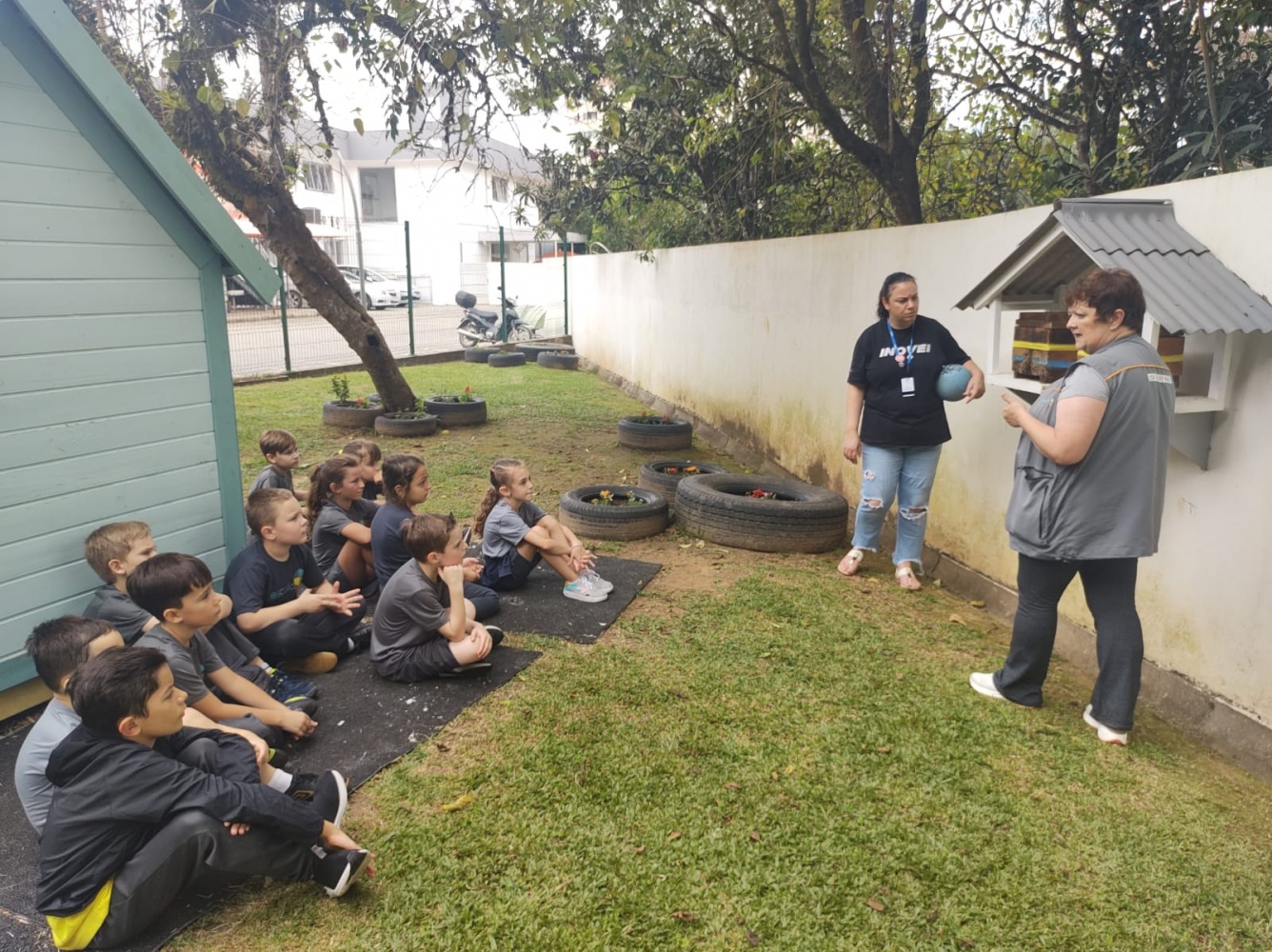 Na Escola S, em São Bento do Sul, a horta comunitária recebeu também a complementação da criação de abelhas sem ferrão. Elas foram trazidas ao espaço externo para que as crianças aprendam a cuidar e a valorizar as espécies que integram a natureza.